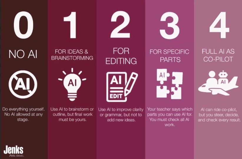 To say that you haven’t used AI ever would be most likely incorrect -- from teacher or student, it's implemented in almost everything now. It makes our lives immensely easier, but easier doesn’t always mean better. School policy at Jenks high school is if AI has done your assignment, then you will receive a 0, it's viewed as the same as cheating. However, some teachers follow their own procedures. Some teachers give out 50s, and some just have a conversation with you about use (how and why) and then you just re-do the assignment.