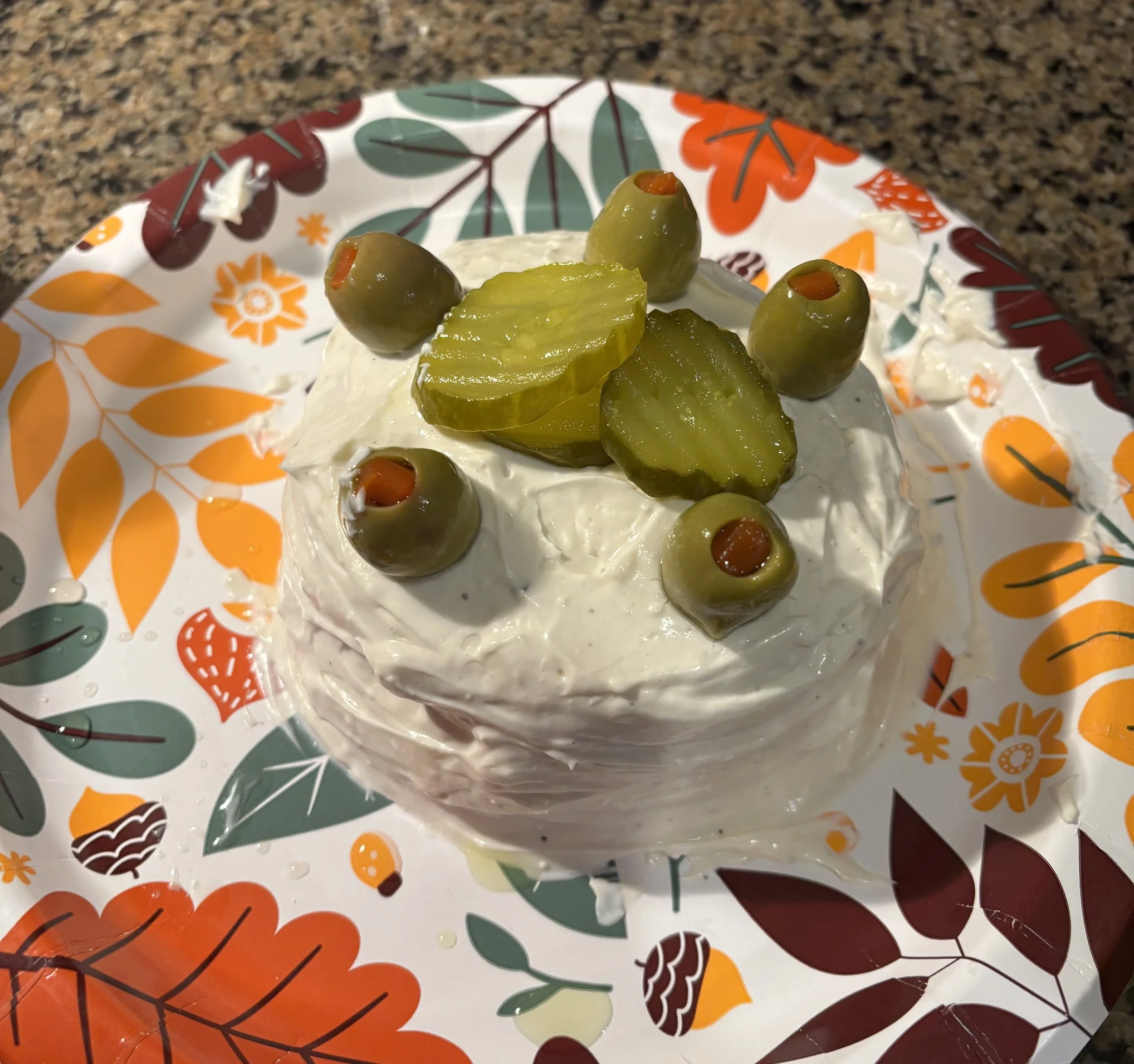Somewhere, down in the deep south of Alabama, a housewife mixed ranch, softened cream cheese, layered it between some bologna, and decided it would be a delicacy for dinner parties. Honestly, though, the most shocking part of this recipe was the olives and pickles as a garnish. Cutting into the layers of bologna, I could already feel the solidity of the meat. My slice quickly fell apart, the ‘frosting’ making a horrible glue for the cake. The initial bite was slimy and wet, full of ranch and only slight hints of bologna. This made me think Hey, this won’t be too bad!, to which I was quickly proved wrong by the cream cheese flavor slamming into me like a truck. A foul combo, second only to wearing orange and purple together. I tried to like it, I really did, but having chunks of cream cheese with ranch could make me hate anything.
