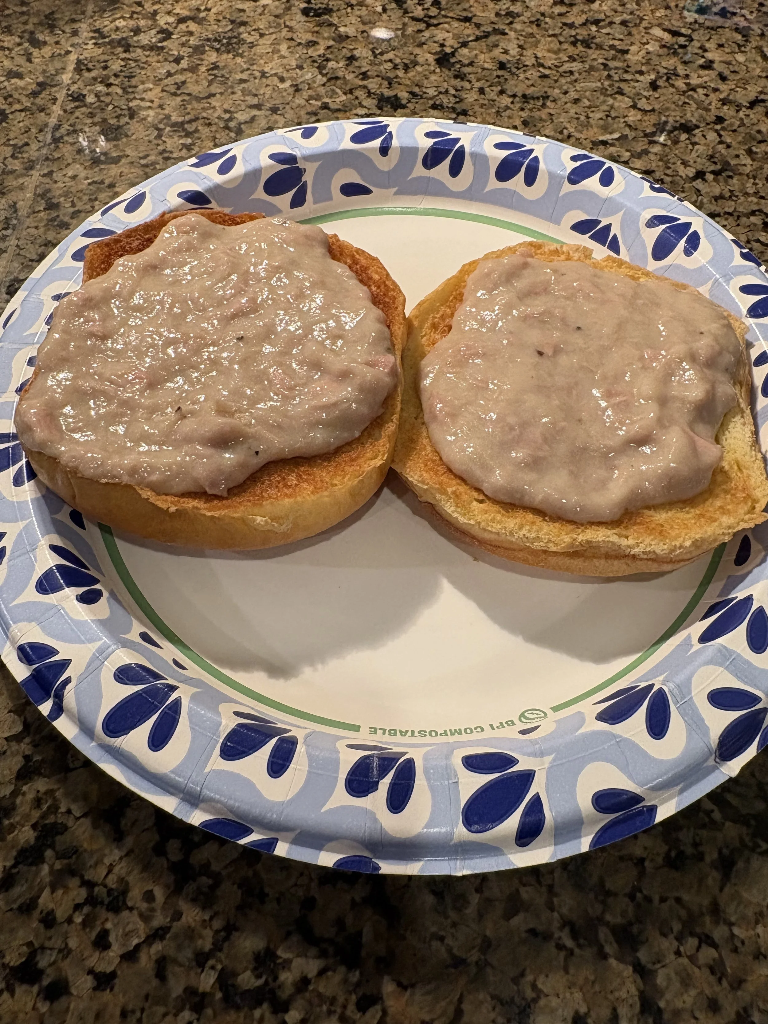 Starting off strong with the best of the worst: Creamed Tuna on toast. Butter, flour, and milk mixed with warm tuna on toast, heated over the stove for a short time, only five minutes. Just staring at it, it looks like gray slop slapped on toast. I know you might be thinking, “That cannot be good,” and you would be correct. The strong tuna flavor overwhelmed the simple salt and pepper seasoning, overwhelming all my senses with fish. The butter-flour-milk mixture was indecisive on which texture it wanted to be, somehow becoming slightly thick and runny at the same time. Combining that with chunks of tuna made for an interesting texture I had never had before. But this recipe surprised me by not being absolutely terrible, and dare I say slightly tasty. Overall, the flavor was fishy but decent, the big problem being the slop-like texture, only redeemed by the crunch of the toast it was served on.