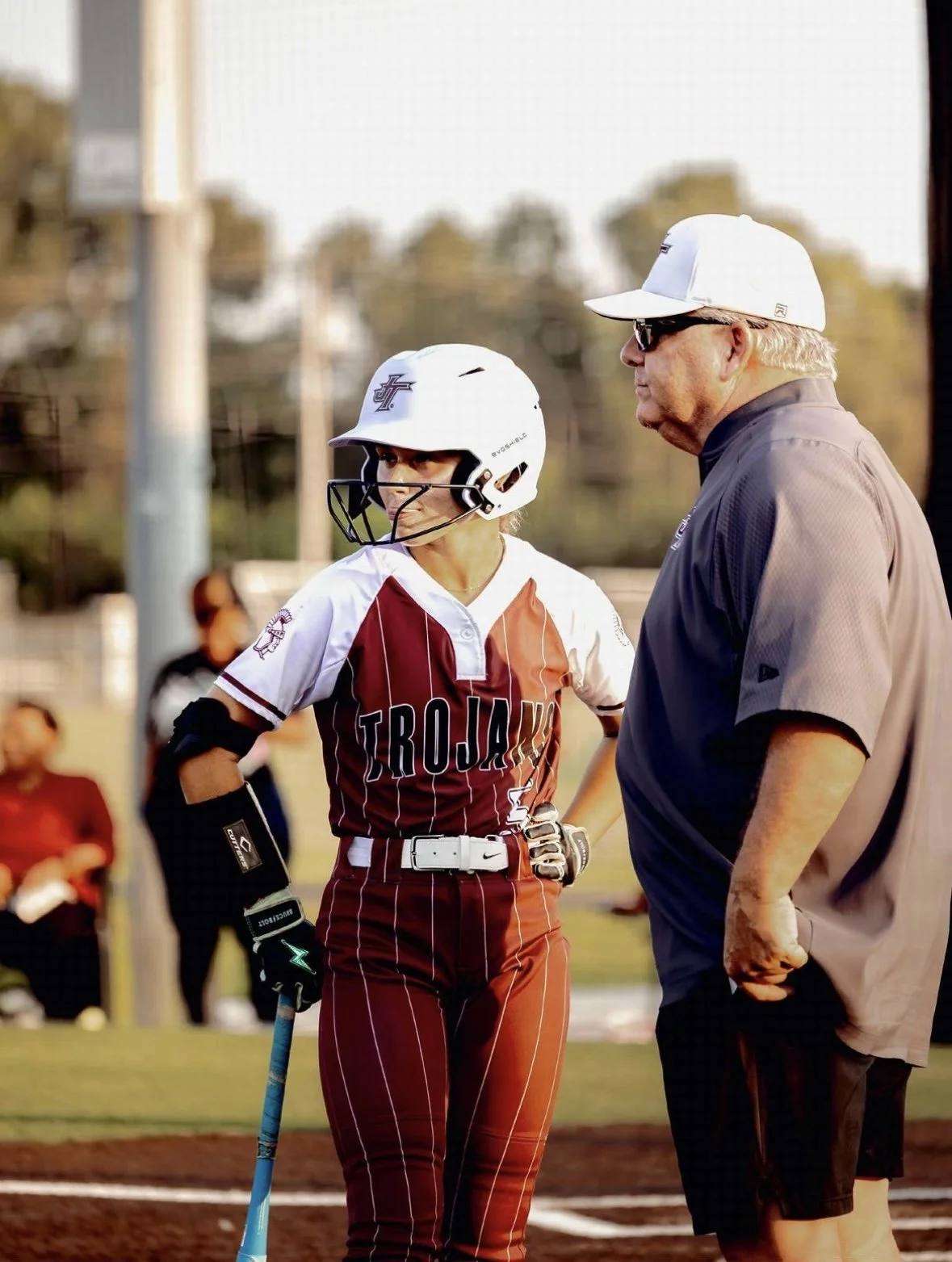 Temperance Parker gets advice from her coach before stepping up to bat for the Trojans.