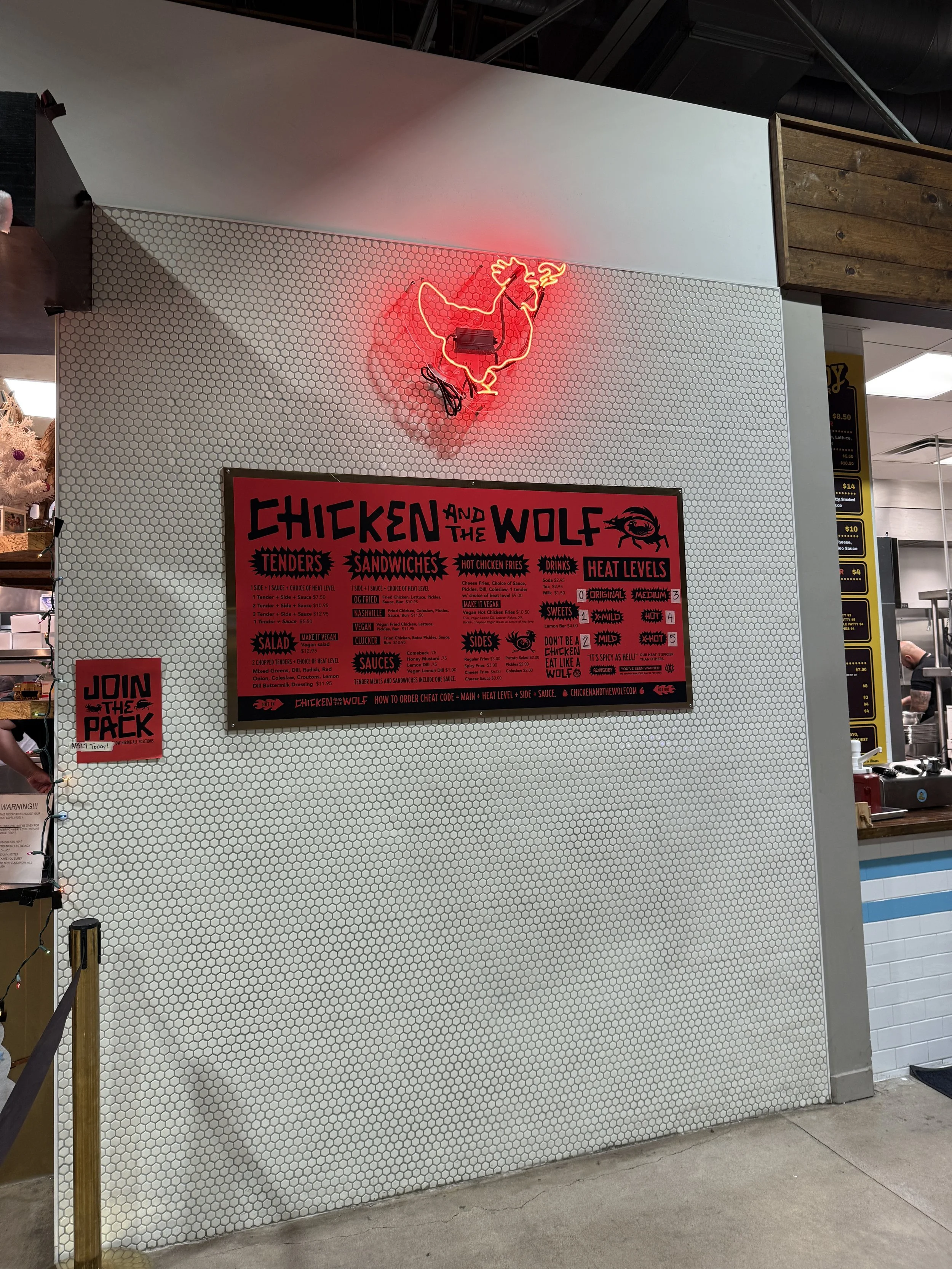 Image of the menu and logo of Chicken and the Wolf at Mother Road Market.
