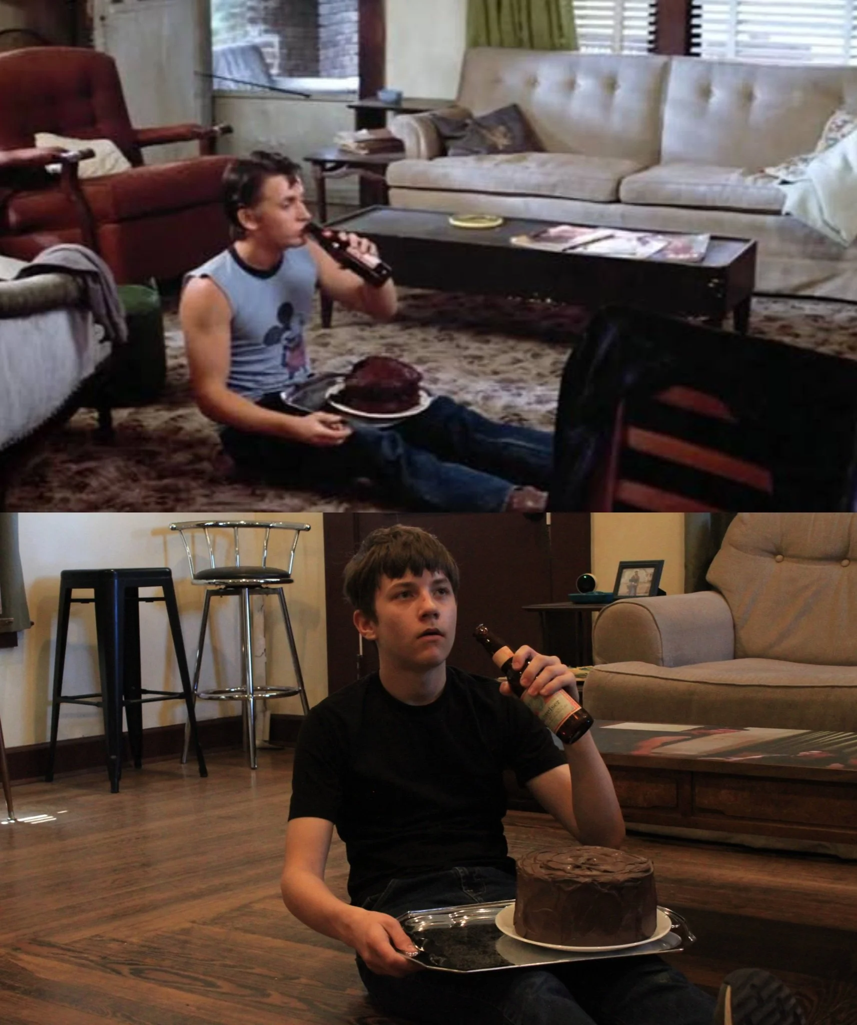 The morning after Ponyboy returns home, Twobit comes over for his breakfast of chocolate cake and beer, which he eats on the curtis living room floor while watching Mickey Mouse on their TV. Grayson played Tobit in this scene with the plastic chocolate cake and bottle that the Outsiders Museum keeps.