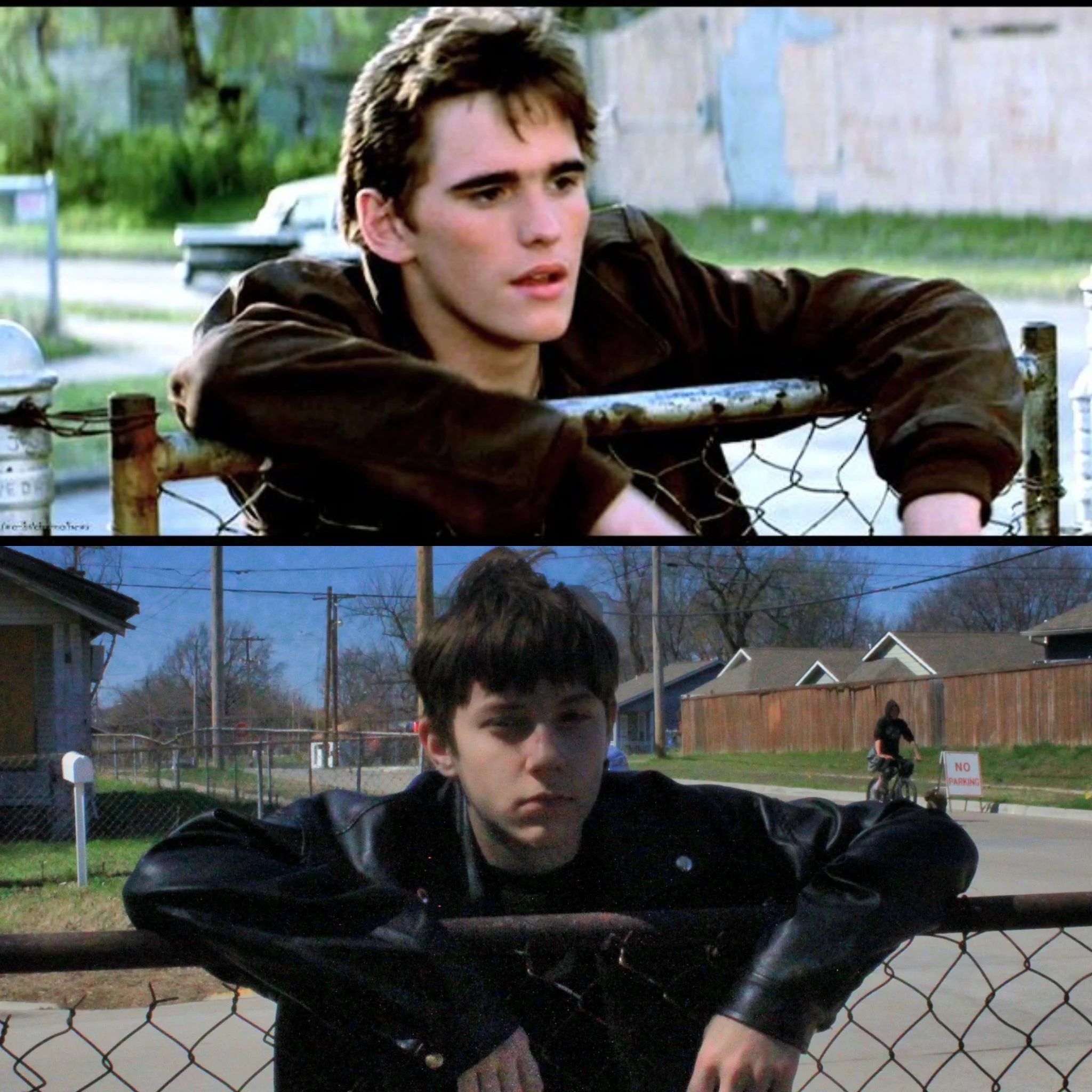 After Ponyboy gets Jumped on his way home from the movie theater his gang of friends run to his rescue, this shot is from after they scared the soches off and all return to the Curtis house. Dally is hanging on the fence talking to Johnny and Ponyboy about his time in jail. The wall that you can see in the background of the original no longer exists. In our recreation we have Grayson playing Dally.