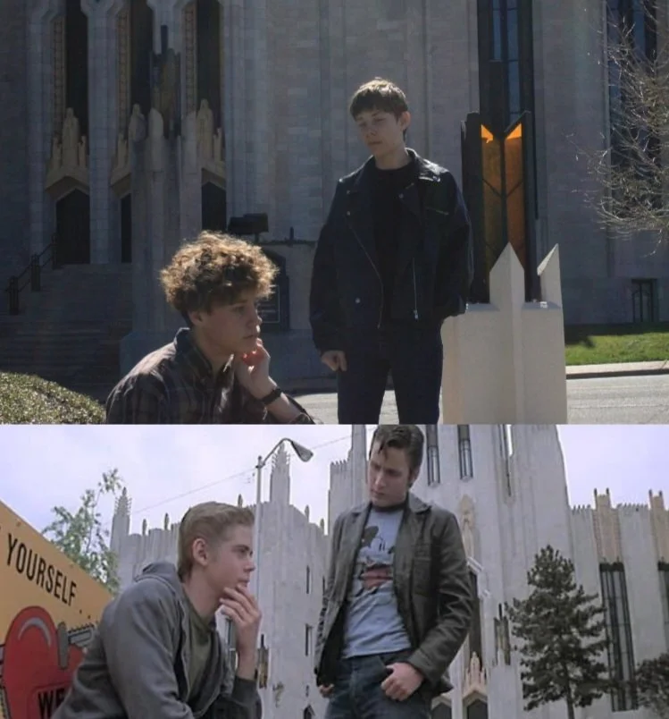 On Ponyboy’s first day back, Twobit takes him to visit Dally and Johnny at the hospital, and then they go to the bus stop outside of the Boston Avenue United Methodist Church. In this photo, Grayson is playing Twobit, and Mason is playing Ponyboy. The bus stop that they are sitting at does not exist anymore in the same spot, so in order to get the sitting pose, we had a mason sitting on the side of a flower bed, so the photo may not be at the exact same angle, but he had to sit somewhere.