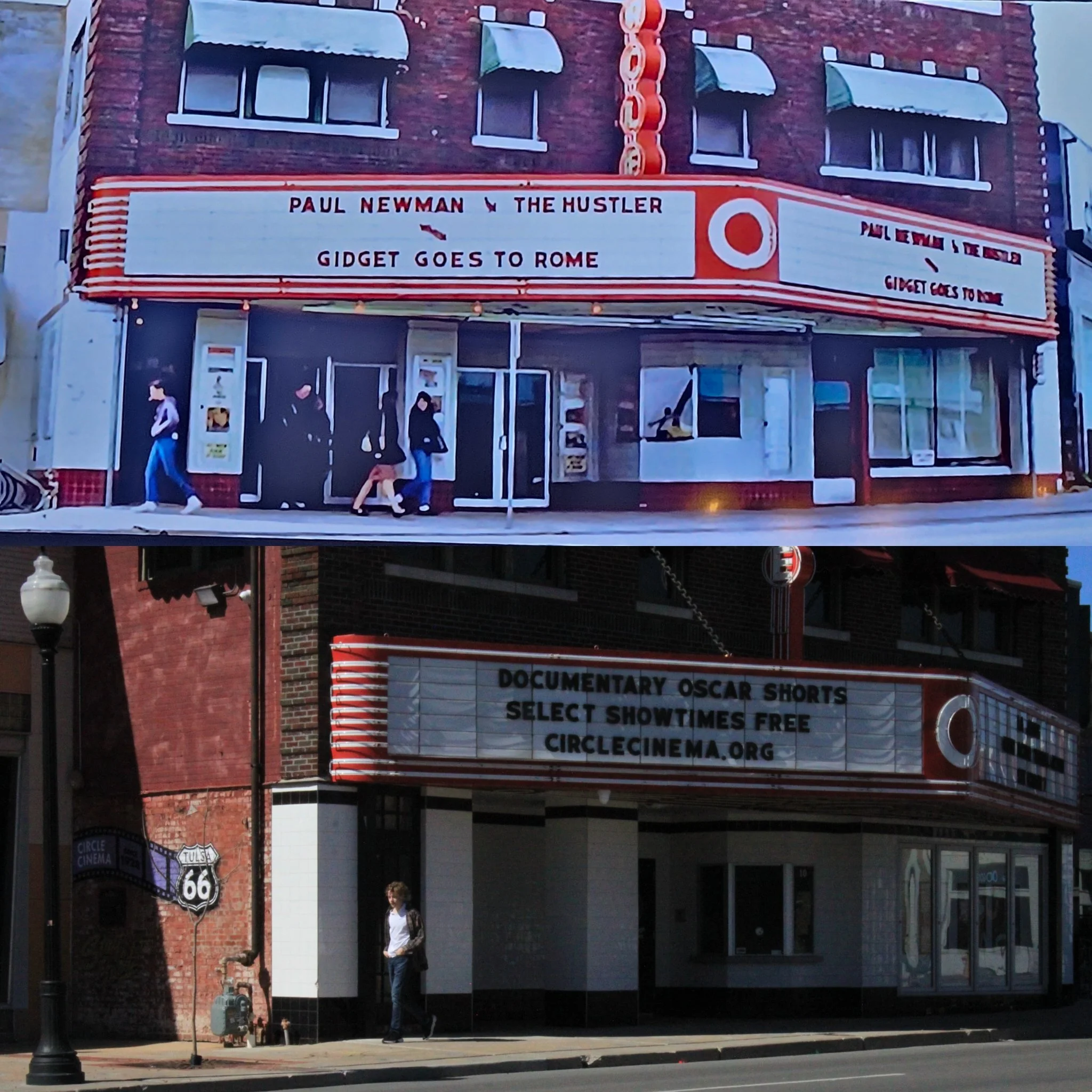 The opening scene of the movie is Ponyboy Curtis walking out of Circle Cinema movie theater after watching The Hustler. The top photo is the original and the bottom photo is our recreation where we have Mason playing Ponyboy with a shot of the movie theater at a slightly different angle because I would have to stand in the middle of the road to get that angle and I was not in the mood to get run over.