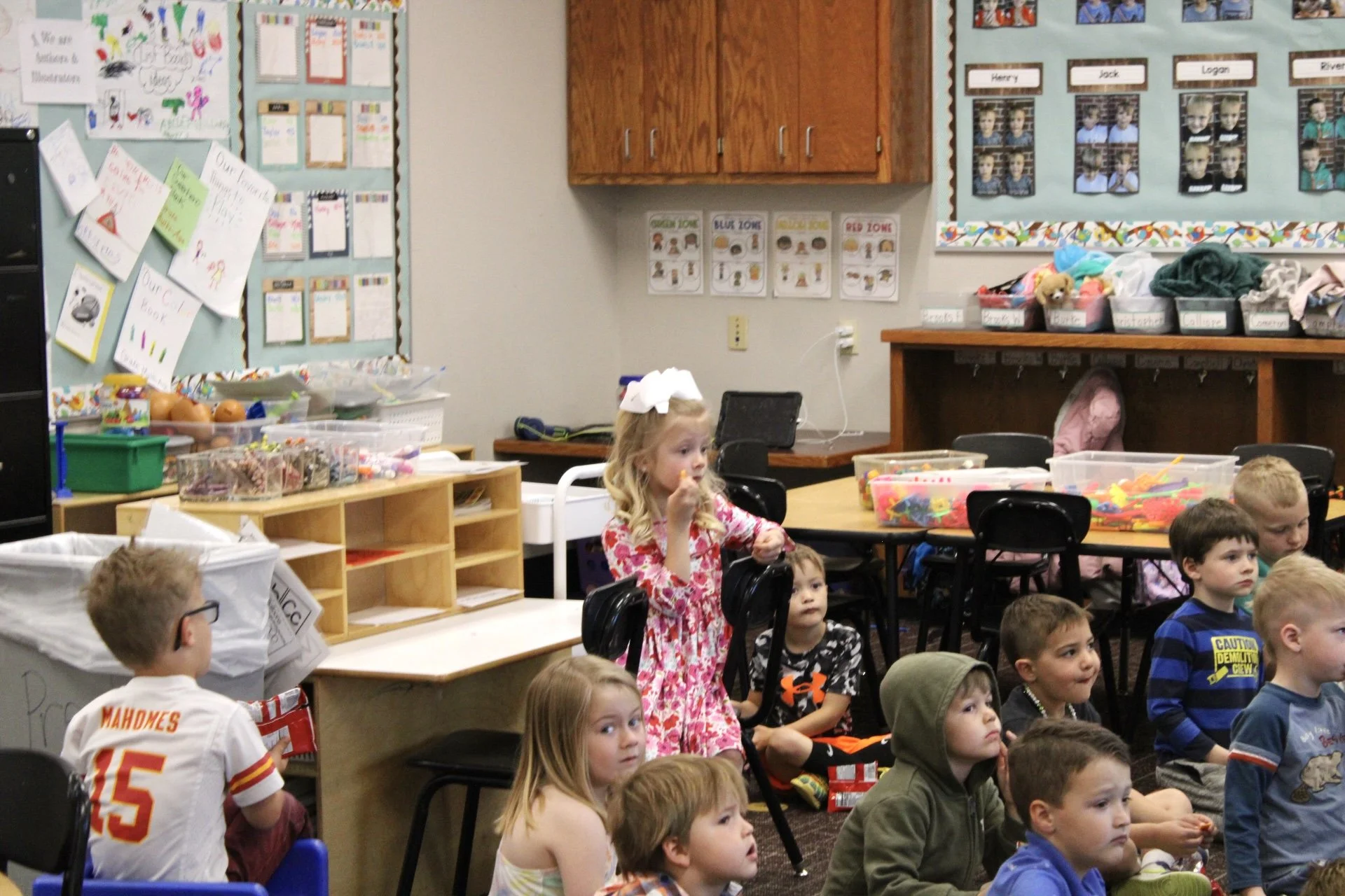 Students watch the board as they enjoy their snack and learn their lesson of the day.