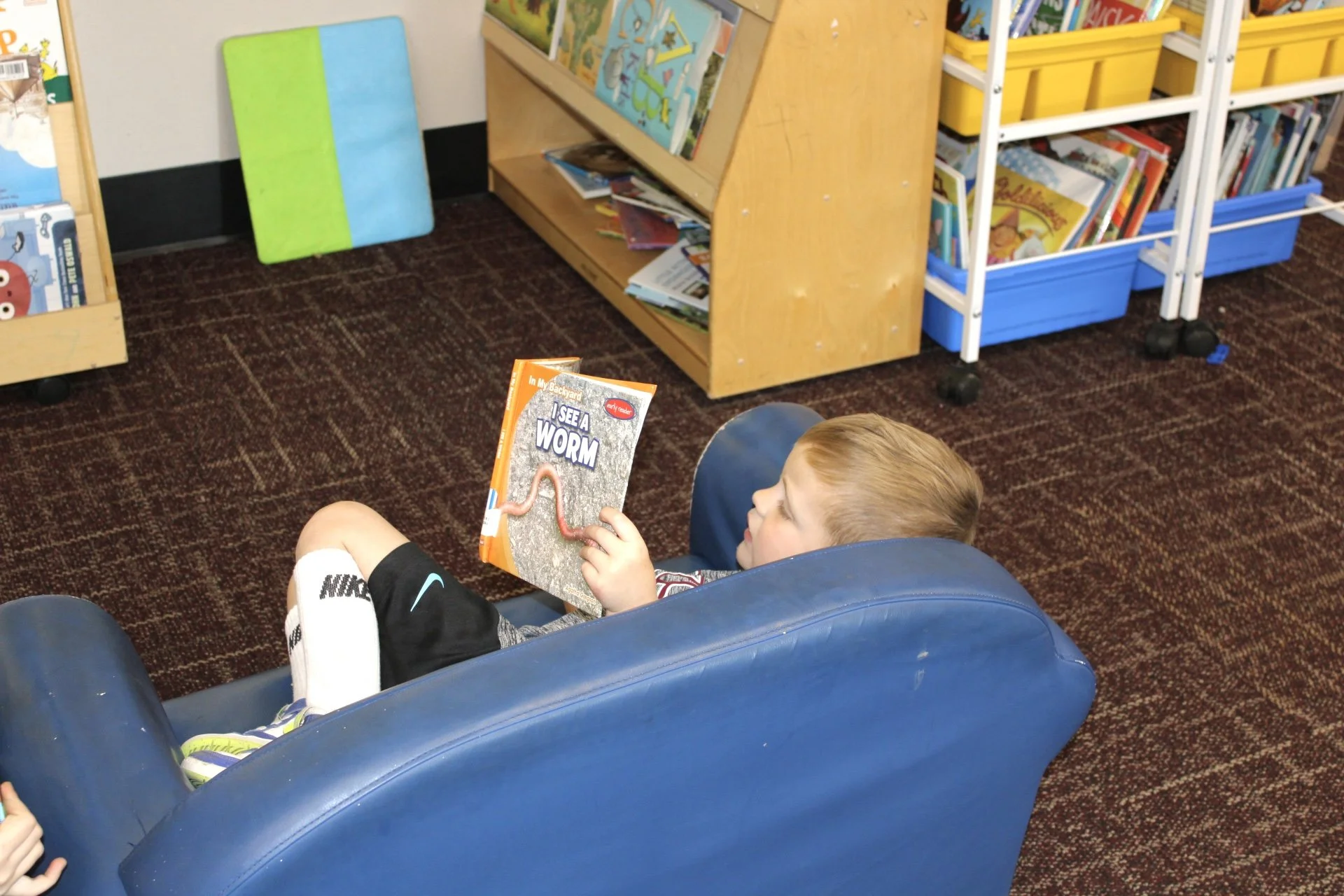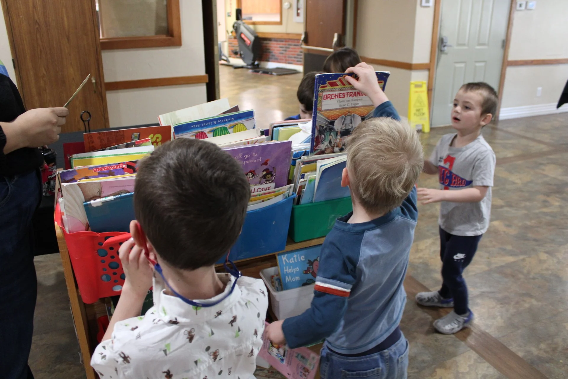 Students gaze upon the shelf of books as they each choose one to read with the "grands".