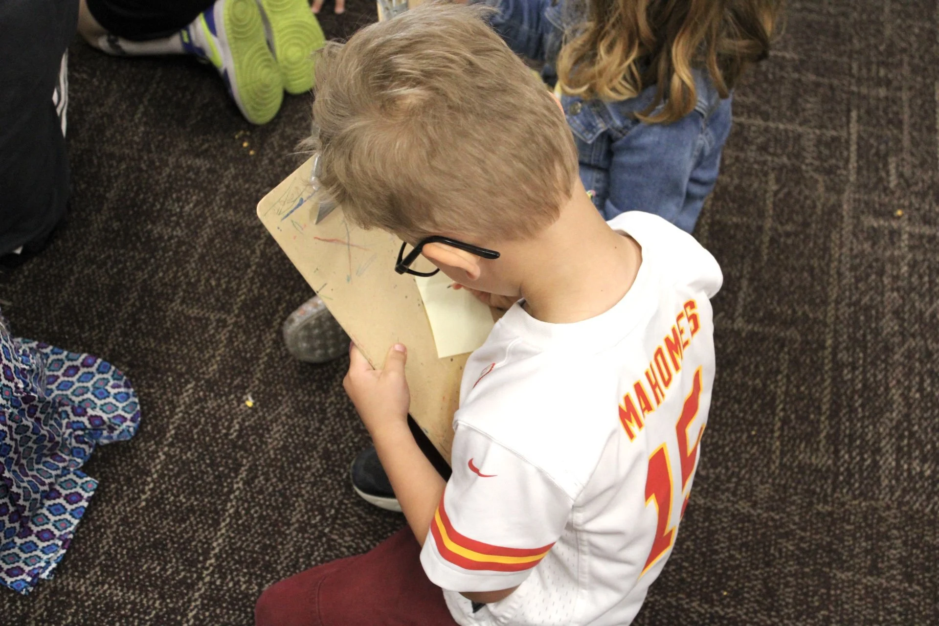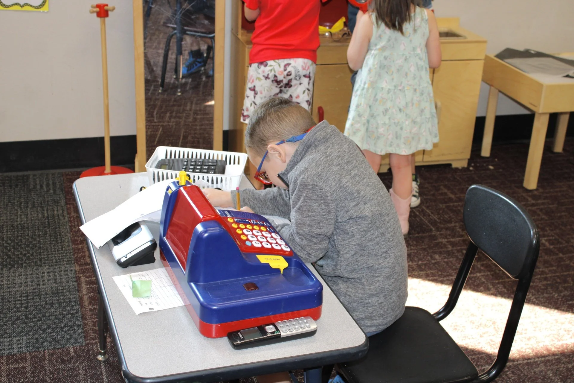 A student gazes intently at his numbers while he approves a purchase of one of his customers during the dramatic play center.
