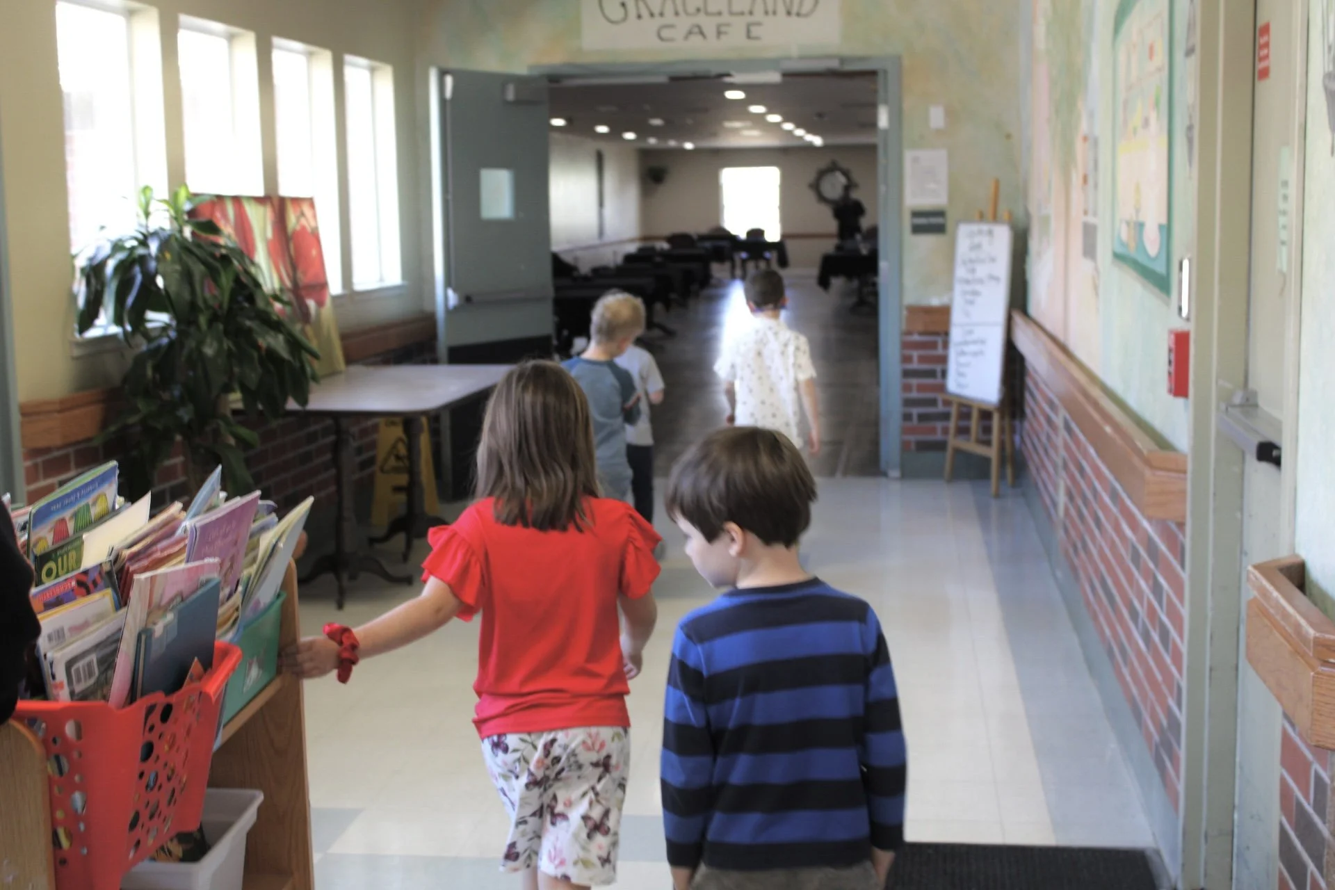Students walk to the residents cafeteria where they meet the "grands" for book buddies.