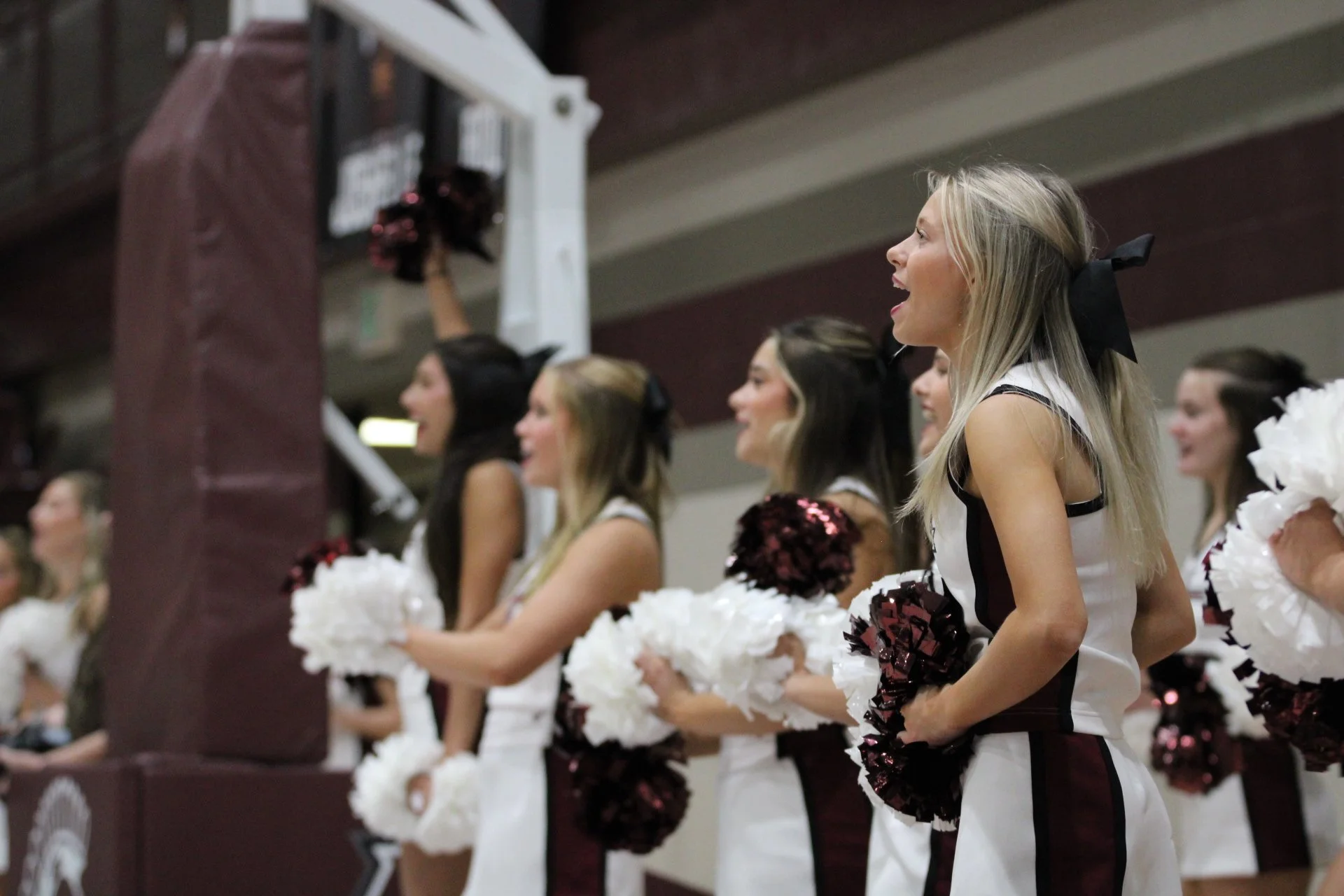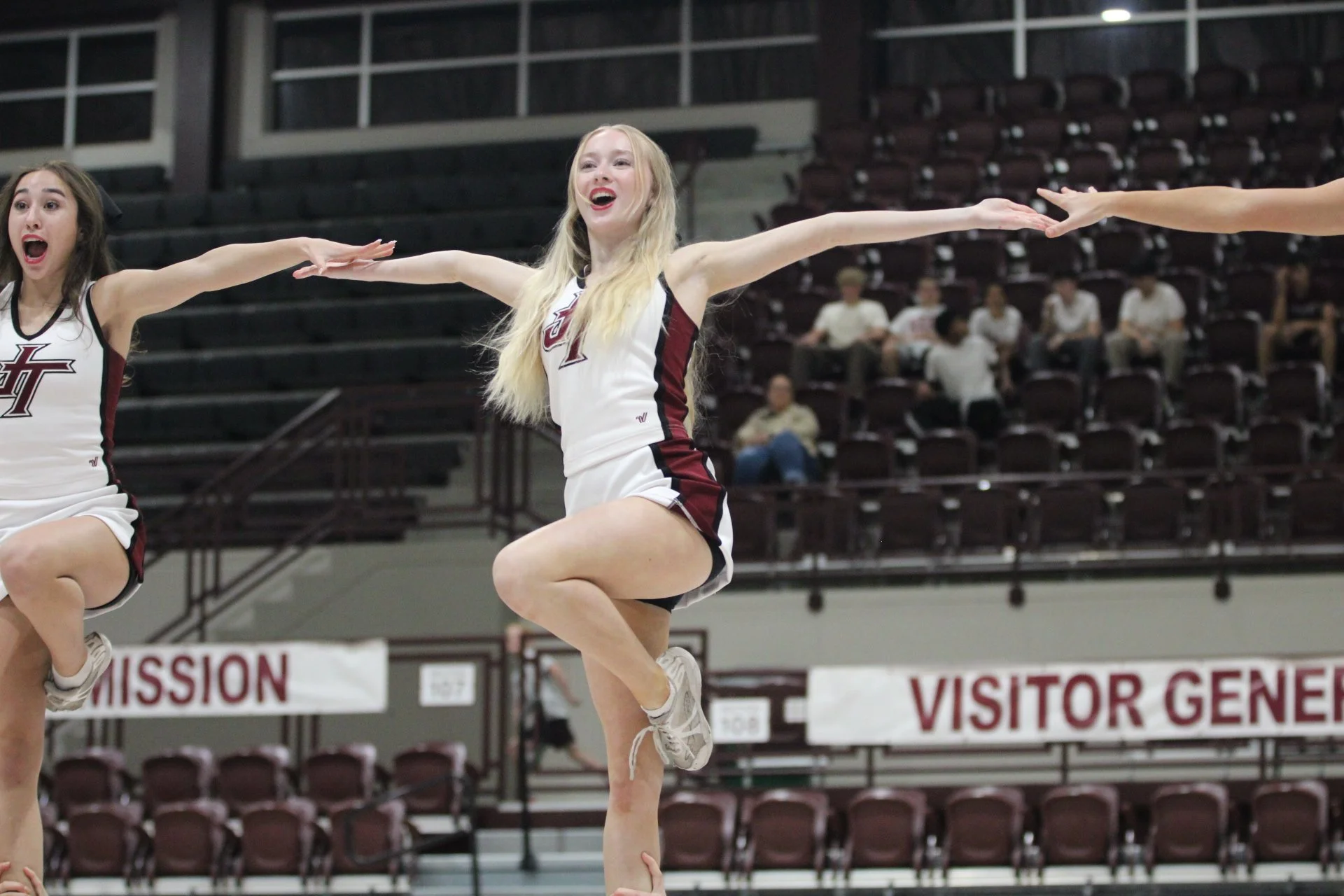 Reil energizes the crowd while her teammates hold her steady, a symbol of trust and unity between the girls.