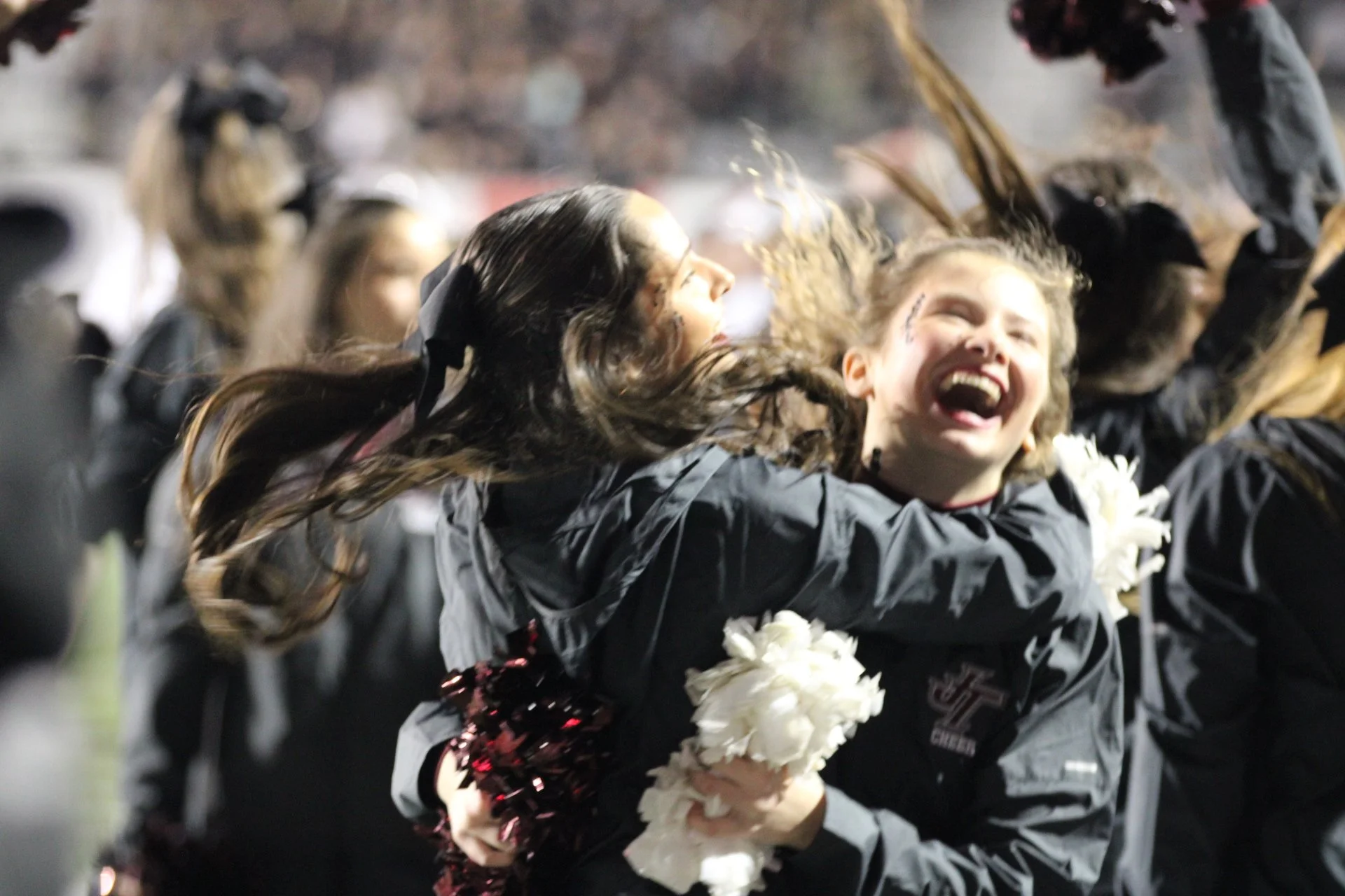 Junior Sophia Bolden and Sophomore Lyla Summerlin celebrate a Trojan Touchdown. "Everyone on is super close so it’s really easy to trust everyone," said Reil.