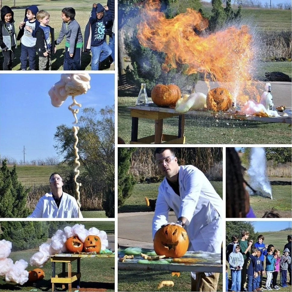 Mr. Morris blowing up a pumpkin for his 3rd grade Heritage Hall class in OKC.
