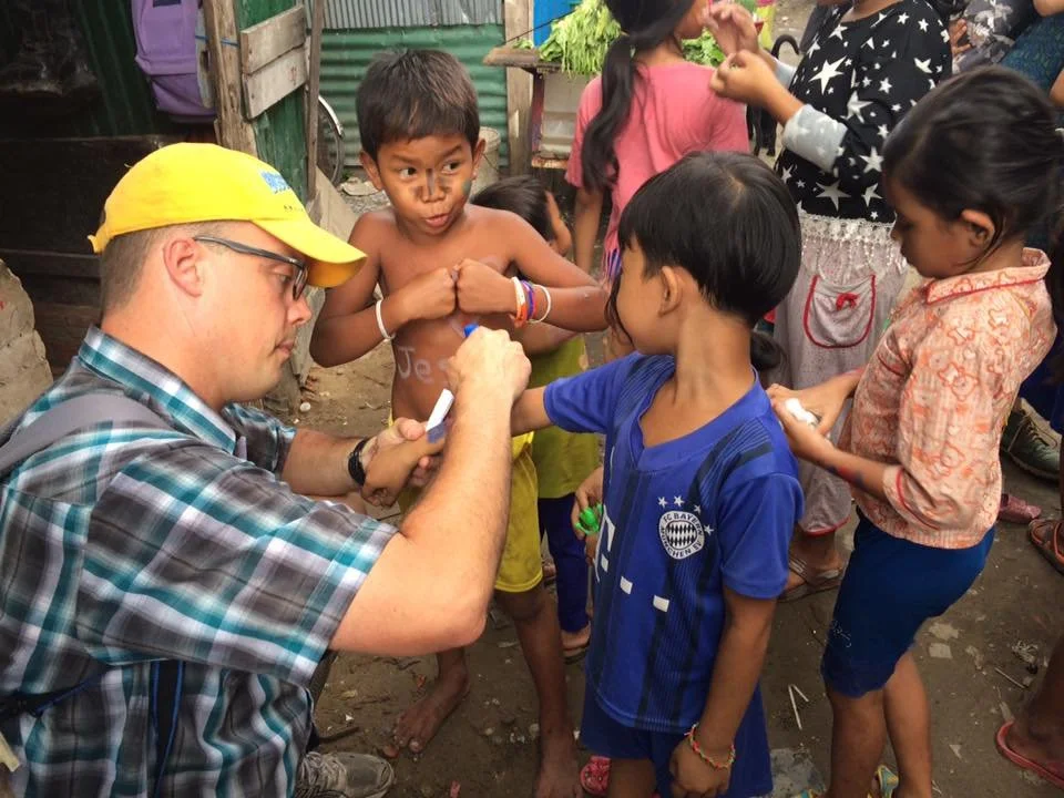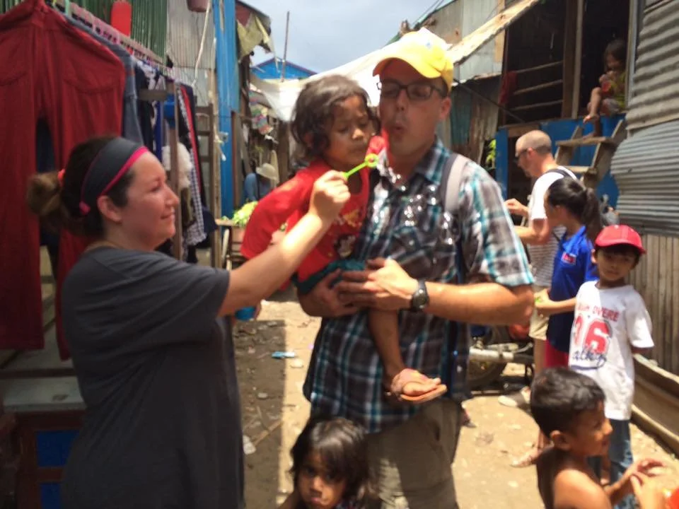 Mr. Morris blowing bubbles and coloring with kids in Cambodia (photos 5 and 6).
